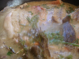 Commencez par faire votre fumet de poisson dont la saveur, je vous l’assure, n’aura absolument rien à voir avec ceux que l’on trouve en poudre ; n’hésitez pas à conserver les parures des poissons quand vous en avez et à les congeler pour les ressortir et utiliser dès que vous avez la quantité suffisante pour faire une préparation.