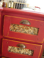 Un petit meuble grainetier bas à tiroirs, j’ai glissé derrière les vitres des pâtes de couleur… et à droite une pin-up style années 50 trouvée dans un vide-grenier…