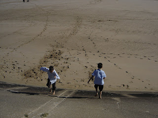 Nous avons prolongé la promenade en allant faire un petit tour sur la plage – sur le parcours de magnifiques tableaux de Titouan Lamazou provenant de son exposition « les femmes du monde« , des portraits saisissants de vérité. Il y a avait aussi beaucoup de monde sur la plage, des petits gamins s’amusaient à monter et descendre la digue.