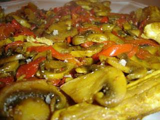 Dans un poêle façon wok versez 1 à 2 càs d’huile d’olive puis mettez-y à suer les champignons. Remuez pendant environ 5 minutes, baissez le feu puis ajoutez les poivrons, versez le vin rosé, ajoutez la tête d’ail hachée, le curcuma, le poivre puis couvrez et laissez mijoter une quinzaine de minutes.