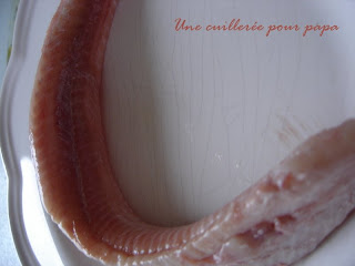 En revenant du travail ce soir je me suis arrêtée à la poissonnerie et j’en ai trouvé sur les étals. Relativement bon marché toute l’année – 8 € le kilo aujourd’hui – ce poisson a le mérite de ne posséder qu’une grosse arrête centrale – comme l’anguille – qui s’enlève toute seule à la cuisson, donc pas de risques pour ceux qui y sont récalcitrants de s’étouffer avec des petites arrêtes incongrues !