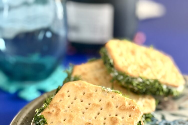 - Pendre un biscuit tuc®, étaler une couche épaisse de crème aux herbes sur toute la surface. Poser dessus un deuxième biscuit sans écraser.
